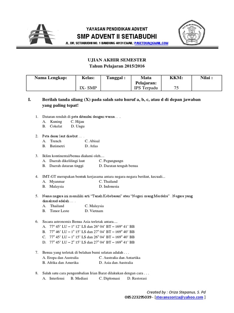 Kherysuryawan.id- kumpulan soal ujian terpelajar (US) tegas dengan kunci diselesaikan mata pelajaran IPS Terpadu kelas 9 SMP. Soal ¢ soal latihan kejam diPEMBAHASAN SOAL UAS IPS SMP 2011 - PDF Free Download